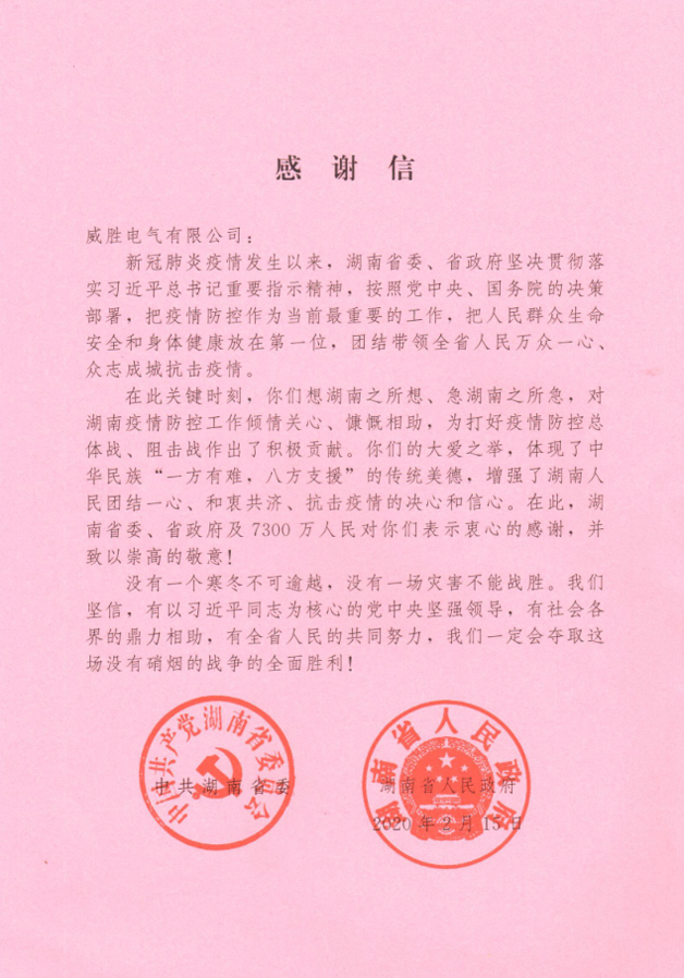 近期,威勝電氣先后收到來自中共湖南省委、湖南省人民政府及湖南省工商業(yè)聯(lián)合會的感謝信,信中表達(dá)了對威勝電氣在疫情期間馳援一線善舉的肯定與贊揚(yáng)。