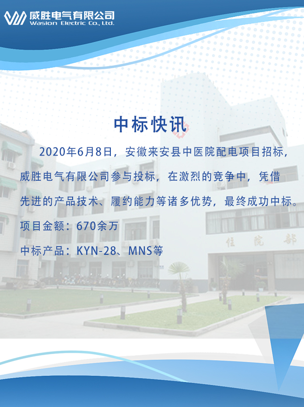 2020年6月8日,安徽來安縣中醫(yī)院配電項目招標,威勝電氣有限公司參與投標,在激烈的競爭中,憑借先進的產(chǎn)品技術、履約能力等諸多優(yōu)勢,最終成功中標。