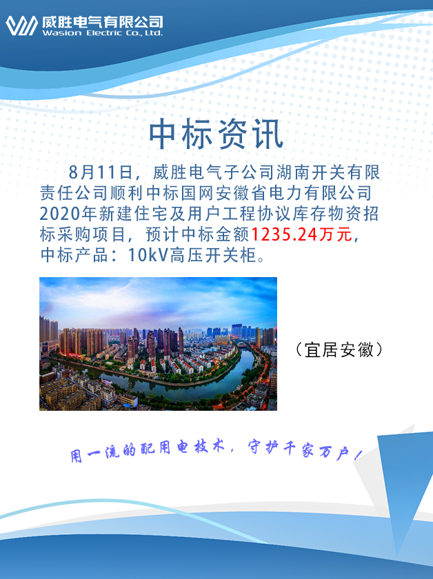 8月11日,威勝電氣子公司湖南開關有限責任公司順利中標國網安徽省電力有限公司2020年新建住宅及用戶工程協議庫存物資招標采購項目,預計中標金額1235.24萬元,中標產品:10kV高壓開關柜。