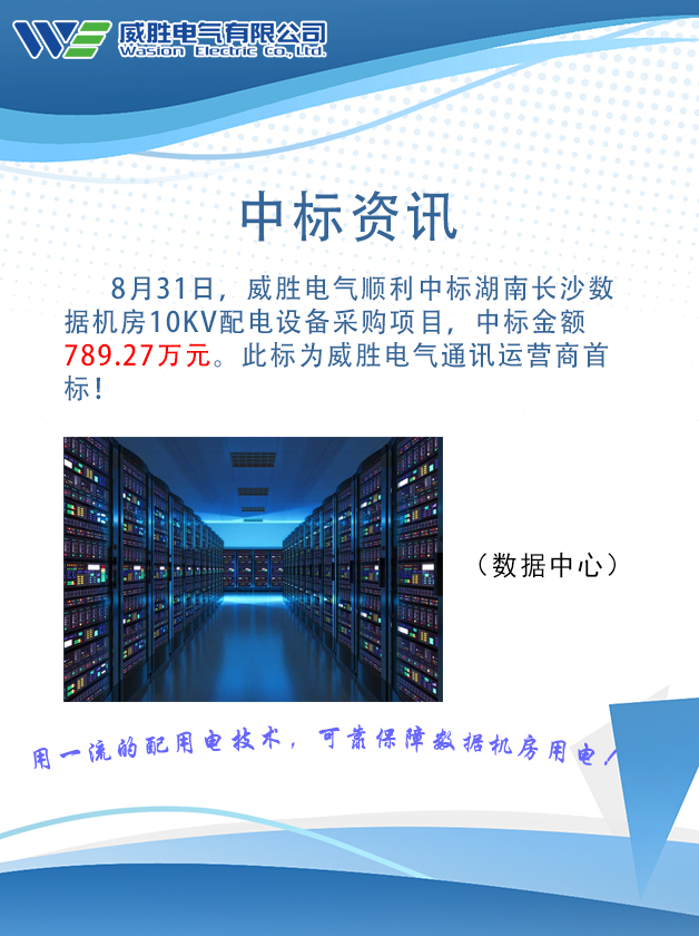 8月31日,威勝電氣順利中標湖南長沙數(shù)據(jù)機房10KV配電設(shè)備采購項目,中標金額789.27萬元。此標為威勝電氣通訊運營商首標!