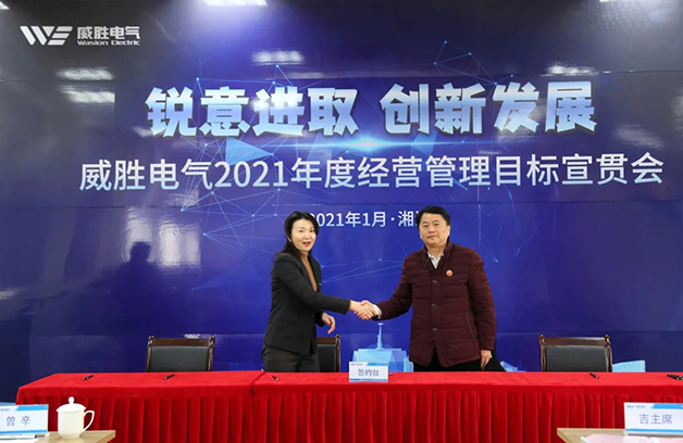 鄧超艷女士宣讀了2021年威勝電氣核心經營管理團隊和核心中層干部的人事任命。在控股董事會及各位領導同仁的共同見證下,電氣董事長、總裁及核心經營管理團隊及核心中層干部正式簽署了2021年度經營目標任務書。