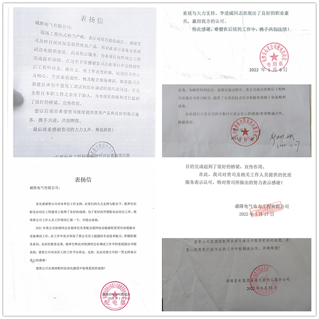 2022年1-3月,威勝電氣收到湖南星電集團、盛隆電力、湖南名正電力、桃源供電公司、贛州市政公用投資控股集團、重慶恩捷新材料、中藍長工比亞迪項目等電網重點工程、省市重點項目客戶的十余份表揚信。感謝信中既有強調我司項目人員超強的專業技術能力,確保了項目在各種客觀因素限制下,依然確保了項目提前驗收通電;也有高度肯定我司項目人員工作態度積極,具有超強的責任心和服務意識和態度,與調試班組同進同退,為項目的順利進行起到了很好的橋梁和示范作用。